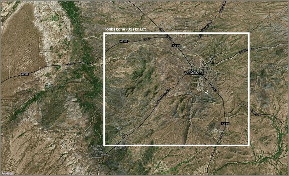 The map below highlights the boundary of what was considered the Tombstone Mining District. The city of Tombstone is near the center, but the district incorporates land to the San Pedro River on the west. The northwest corner of the district includes the former railhead at Fairbank, and the southwest corner includes the mill sites of Millville and Charleston.